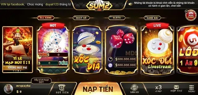 Sân chơi giải trí ăn tiền thật Sum2 Vin có sảnh game gì?